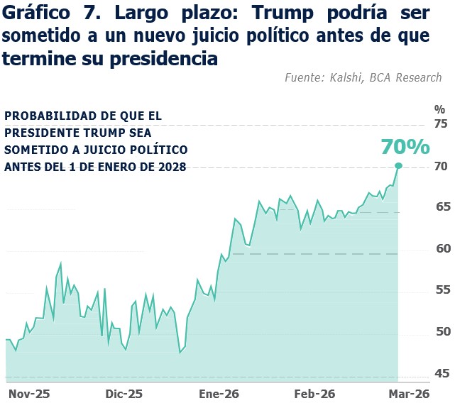 Aunque la guerra tendrá un impacto limitado si se materializa nuestro escenario base, sus consecuen- cias políticas pueden ser significativas debido a que la tolerancia del votante estadounidense a un conflicto prolongado es limitada (ver gráficos 5, 6 y 7). Por eso hemos argumentado que tanto Irán como Estados Unidos tienen incentivos para encon- trar una salida, incluso si el camino es desordenado y no lineal. Para los mercados, esto es relevante porque la variable macro más importante no es simplemente el nivel del precio del petróleo, sino la duración de la disrupción.
