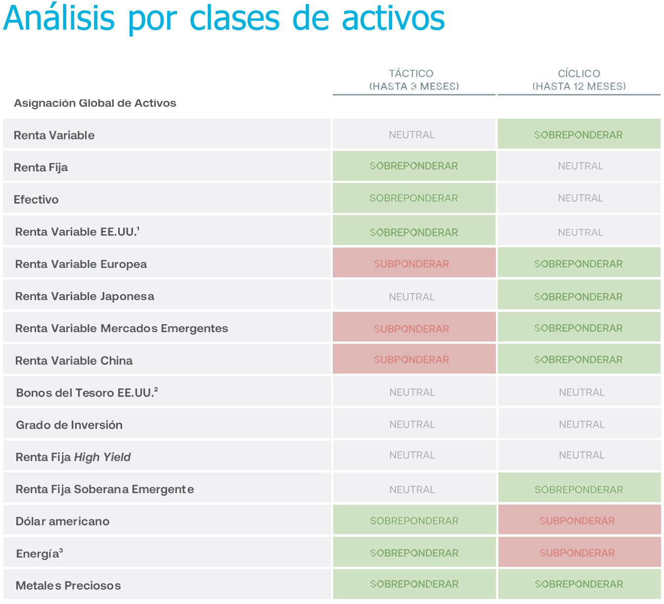 En la práctica, esto implica adoptar una postura más defensiva, enfatizar exposiciones de mayor calidad y ser más selectivos en dónde desplegar coberturas contra inflación y riesgos geopolíticos. En conse- cuencia, favorecemos adoptar una postura táctica- mente más defensiva en los próximos tres meses, mientras mantenemos una exposición moderada al riesgo en un horizonte de doce meses, con prefe- rencia por acciones de calidad, efectivo, oro y TIPS como anclas del portafolio frente a posibles efectos estanflacionarios.