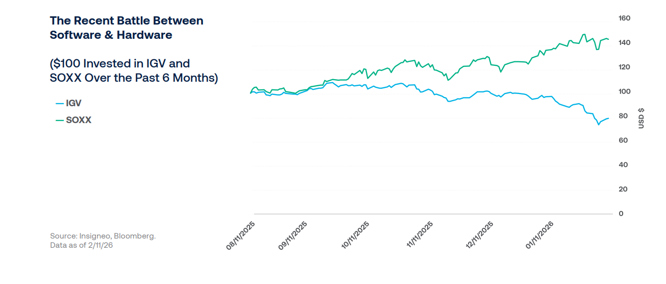 Investor nervousness has led to sharp, sometimes indiscriminate reactions—punishing software stocks amid fears that AI models like Claude will upend the industry—while hardware stocks like semi- conductors have rallied strongly, creating an unprecedented performance gap.